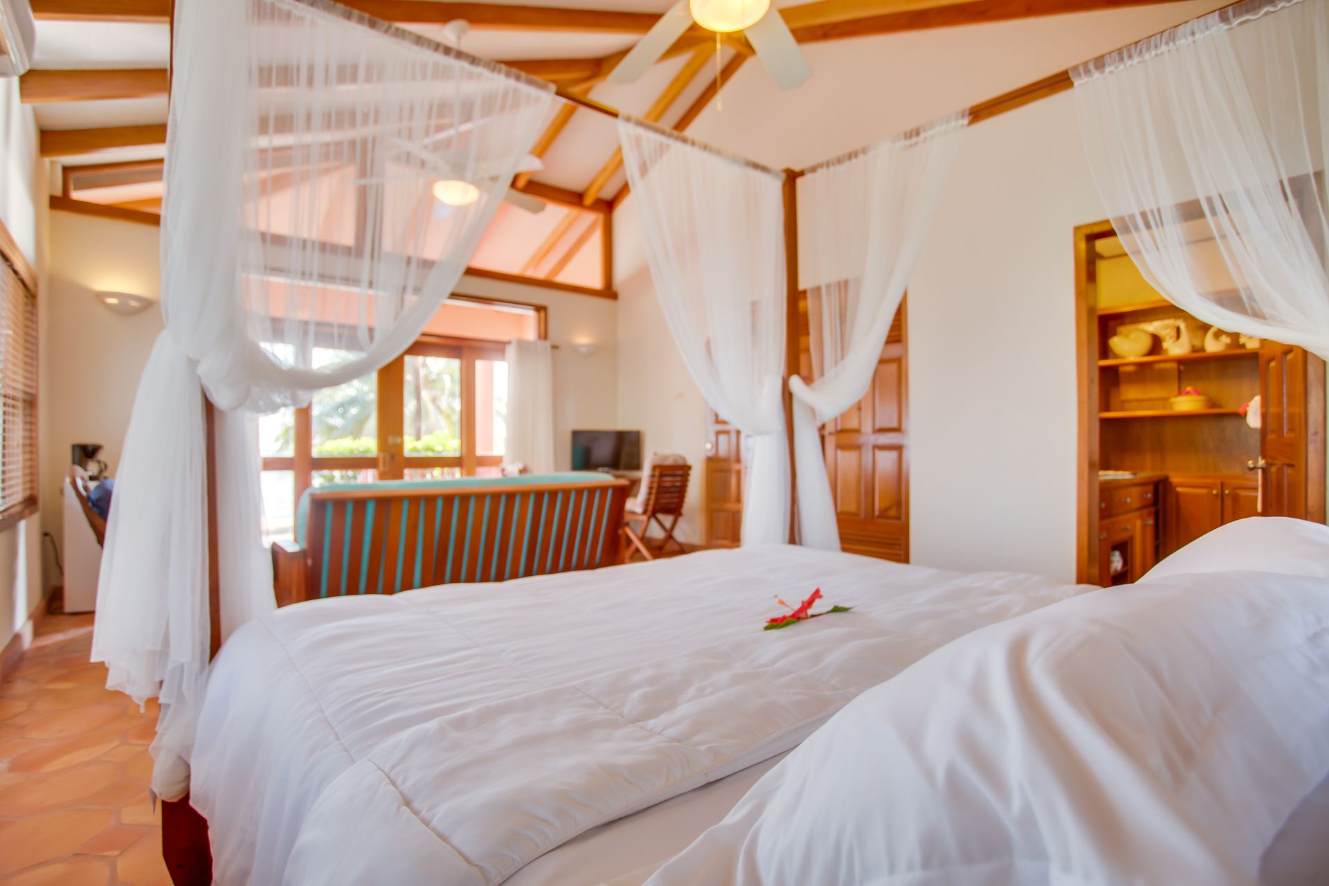 Discover serenity with our spacious three-bedroom, three-bathroom layout. The top floor features a master bedroom with a four-poster king-sized bed, a futon, and an en-suite bathroom with double vanity basins and a walk-in shower. The bottom floor includes a second master bedroom with a king bed and a futon, along with a standard bedroom with a king bed. Each villa boasts over 1,800 square feet of indoor and outdoor living space, complete with vaulted ceilings, exposed beams, french doors, and an open-concept kitchen, dining, and living room. Perfect for families, friends or couples traveling together, our villas combine the comfort of home with the hospitality of Belizean Dreams. With "Ocean View" villas, you'll enjoy views of the Caribbean Sea, though set a bit further from the beach.